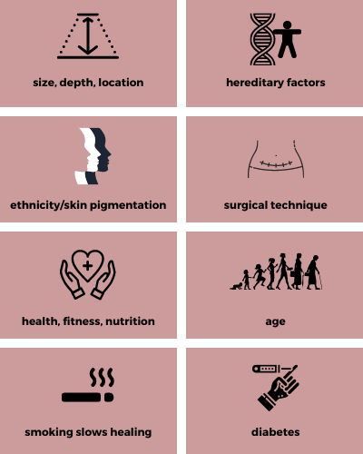 The formation of scars or scar tissue is a normal part of the healing process, and occurs when the skin is cut due to injury or surgery. The growth of scar tissue is influenced by many factors, these include: |