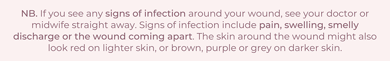 Your caesarean wound will usually be along or just below your bikini line. Very rarely it might be straight up and down your tummy. It will usually have dissolvable stitches or staples. Keeping your wound clean and dry helps to prevent infection. The wound will be covered by a waterproof dressing for several days, and you can usually shower with this on. Once the dressing has been removed, you can gently wash your wound with water and dry around it with a towel. It’s best to leave it uncovered to ‘air dry’. It can be harder to keep your wound dry if it’s under a tummy fold, so you might need to place a soft clean pad under the fold to keep your wound as dry as possible. Some bruising around the wound is common. Numbness or itching around the wound is common too. This can last a long time in some women. Wear loose cotton clothing that doesn’t press on your wound. It’ll take 6-10 weeks for your wound to heal completely. |